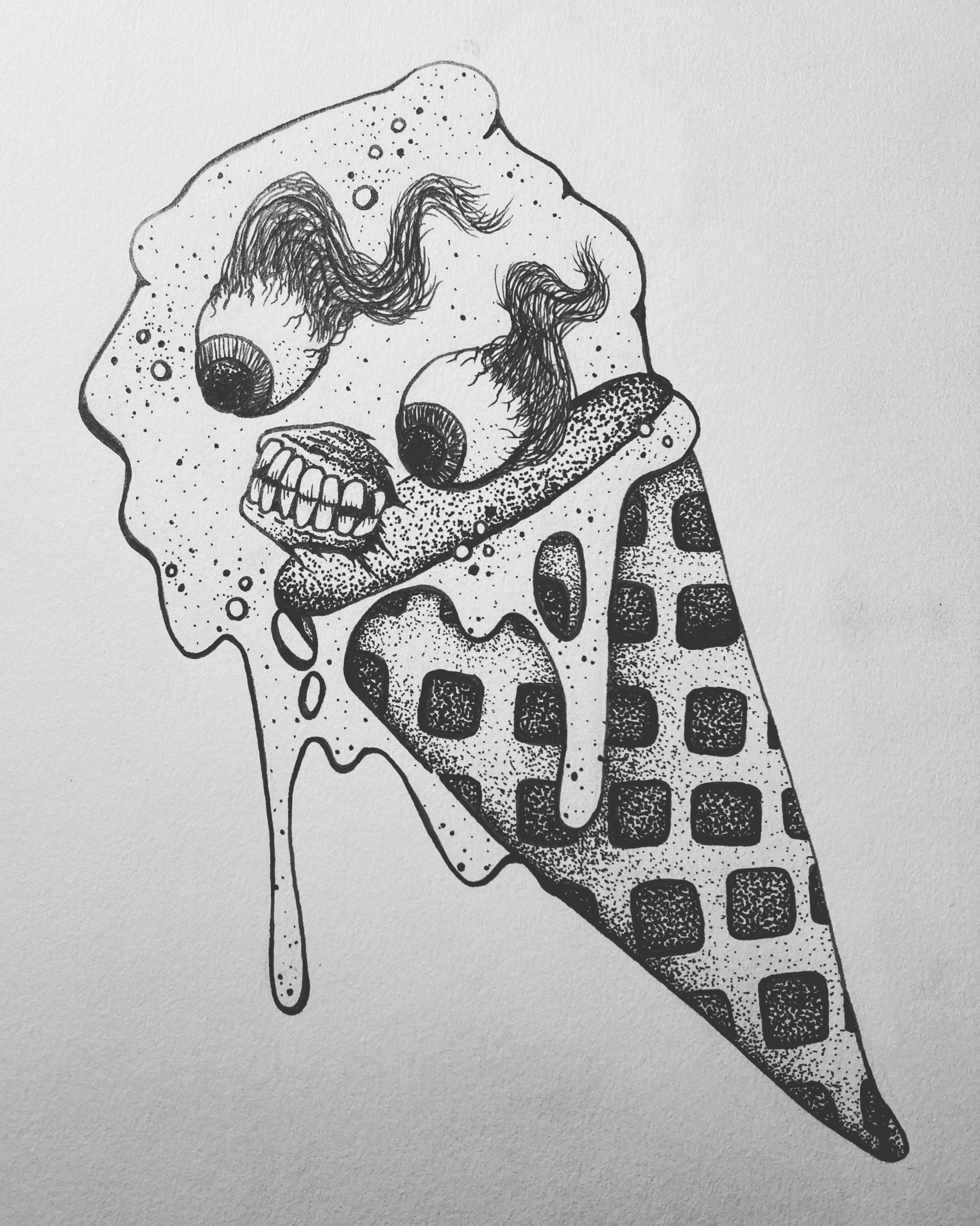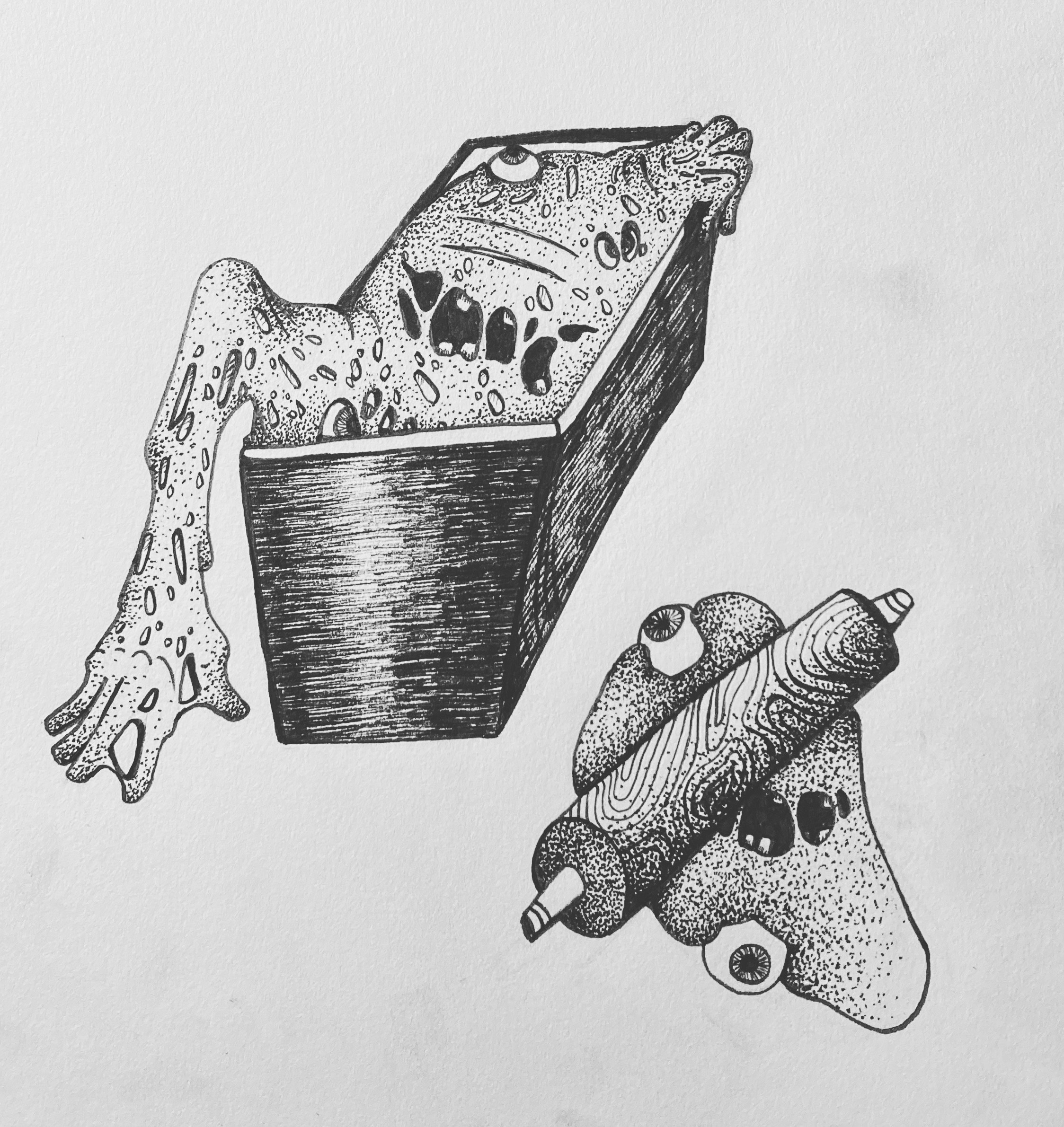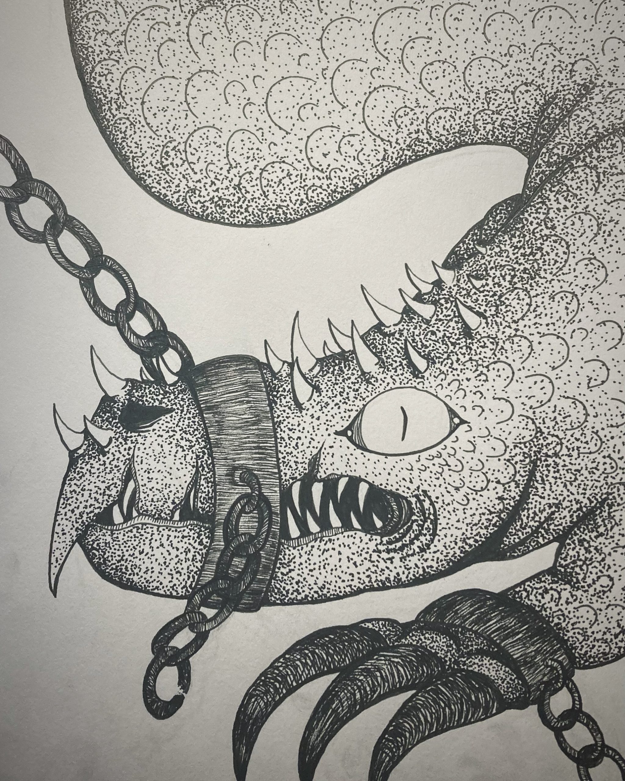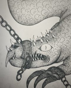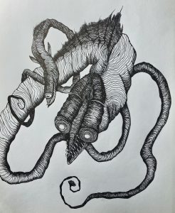 This redrawing of a 2021 piece is of a goblin shark in the deep sea reaching for something unattainable. In doing so, it is also coming apart, which should be a sign that it needs to find new hobbies.