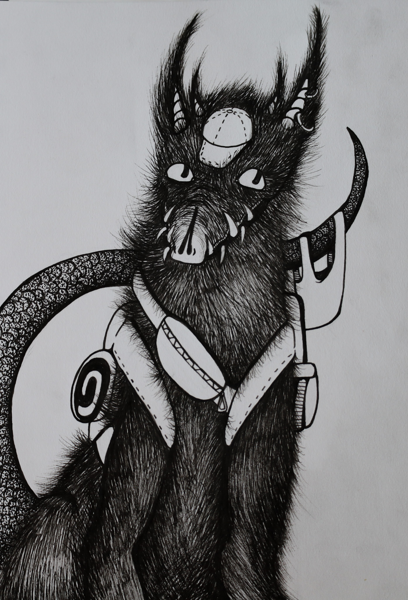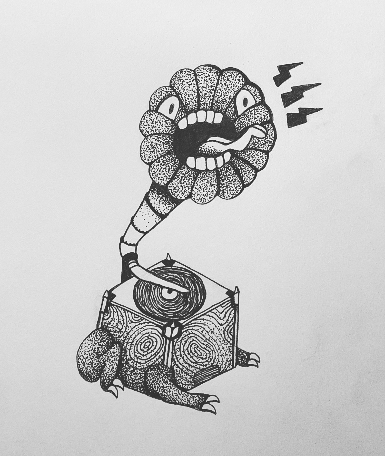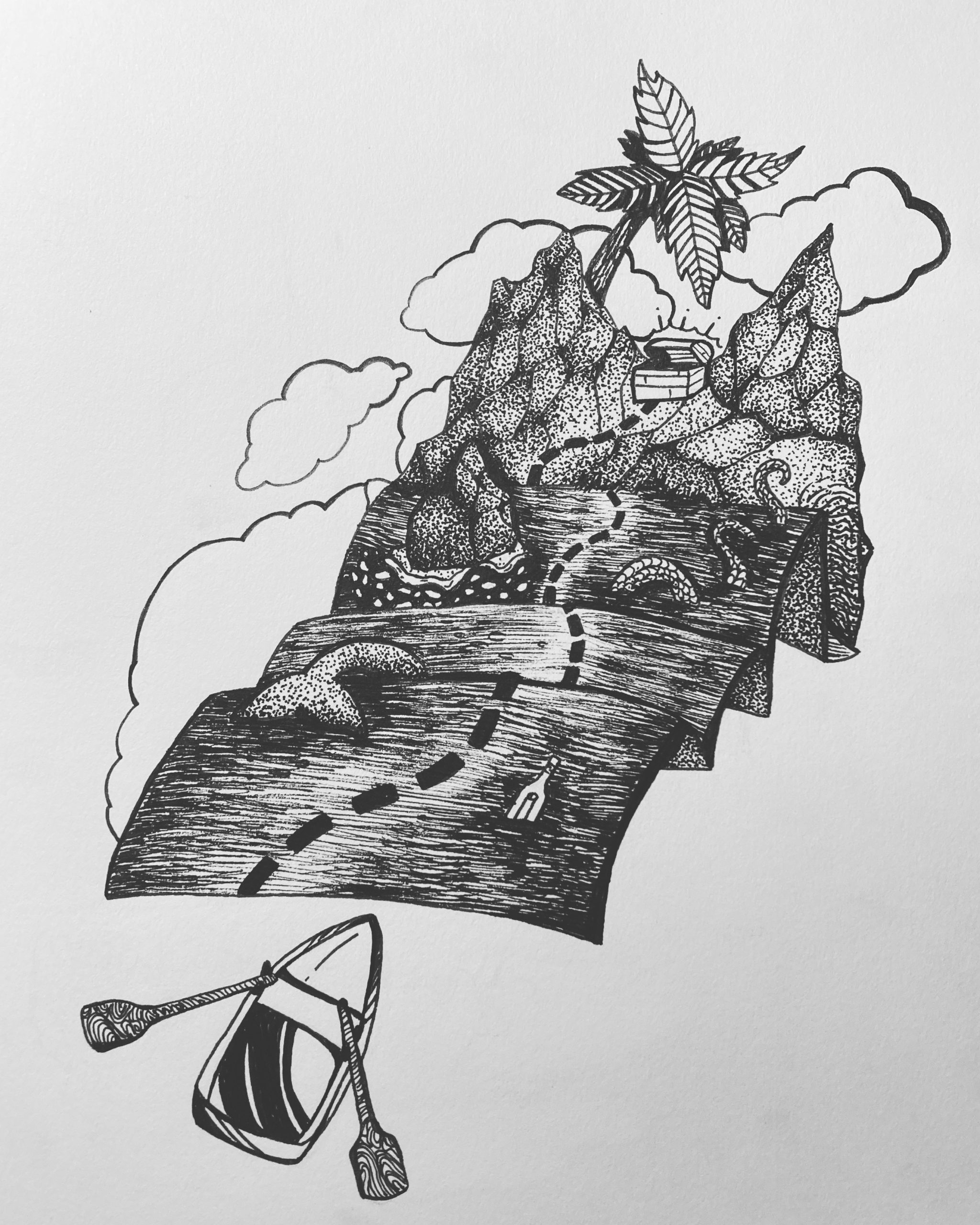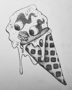 This redrawing of a 2021 piece is of a goblin shark in the deep sea reaching for something unattainable. In doing so, it is also coming apart, which should be a sign that it needs to find new hobbies.