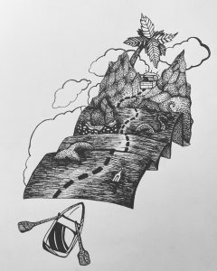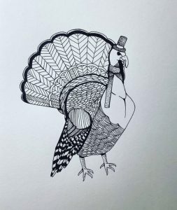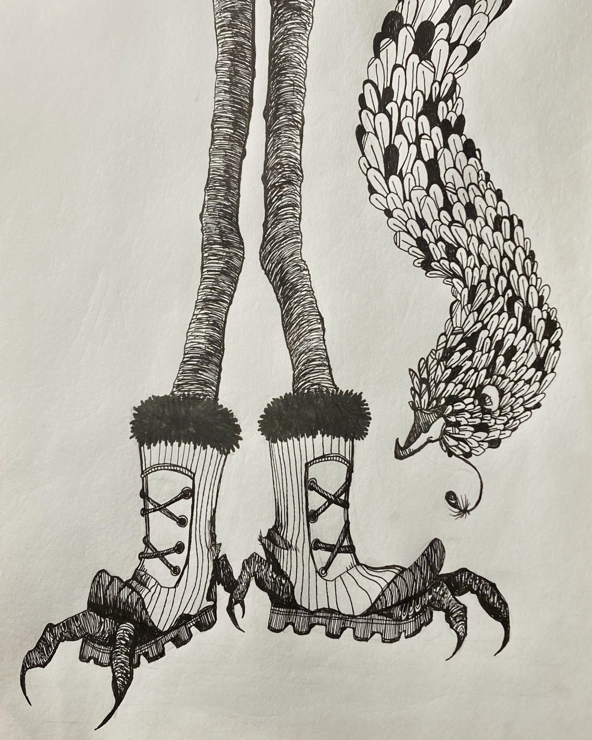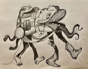 This drawing was inspired by the song “I wish I could wear hats” by Brian David Gilbert and the works of Maria Kalman. This drawing is just comical though, with no hidden meaning.