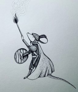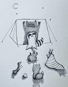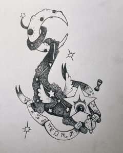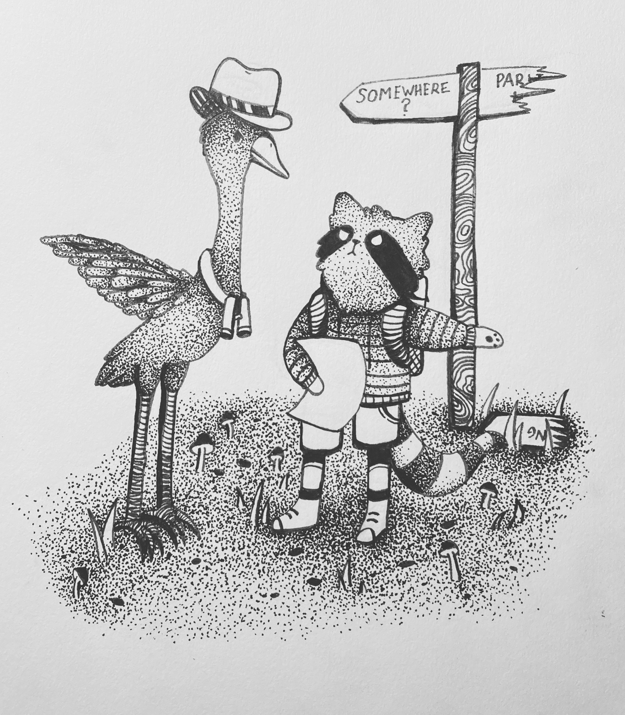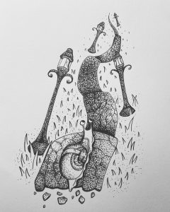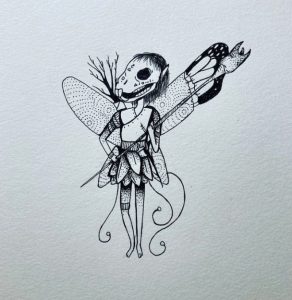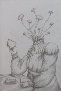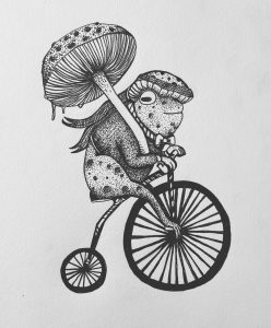 This drawing used reference from an actual photo from the Victorian Era. With that, and a dash of whimsy, it builds the mycological world that exists in the artist’s mind.