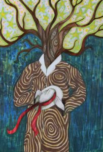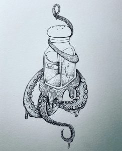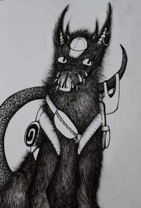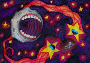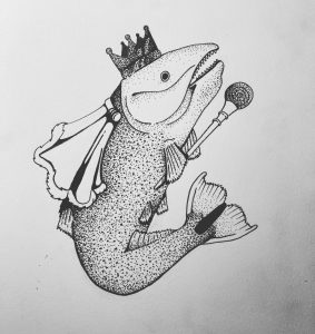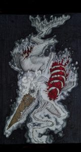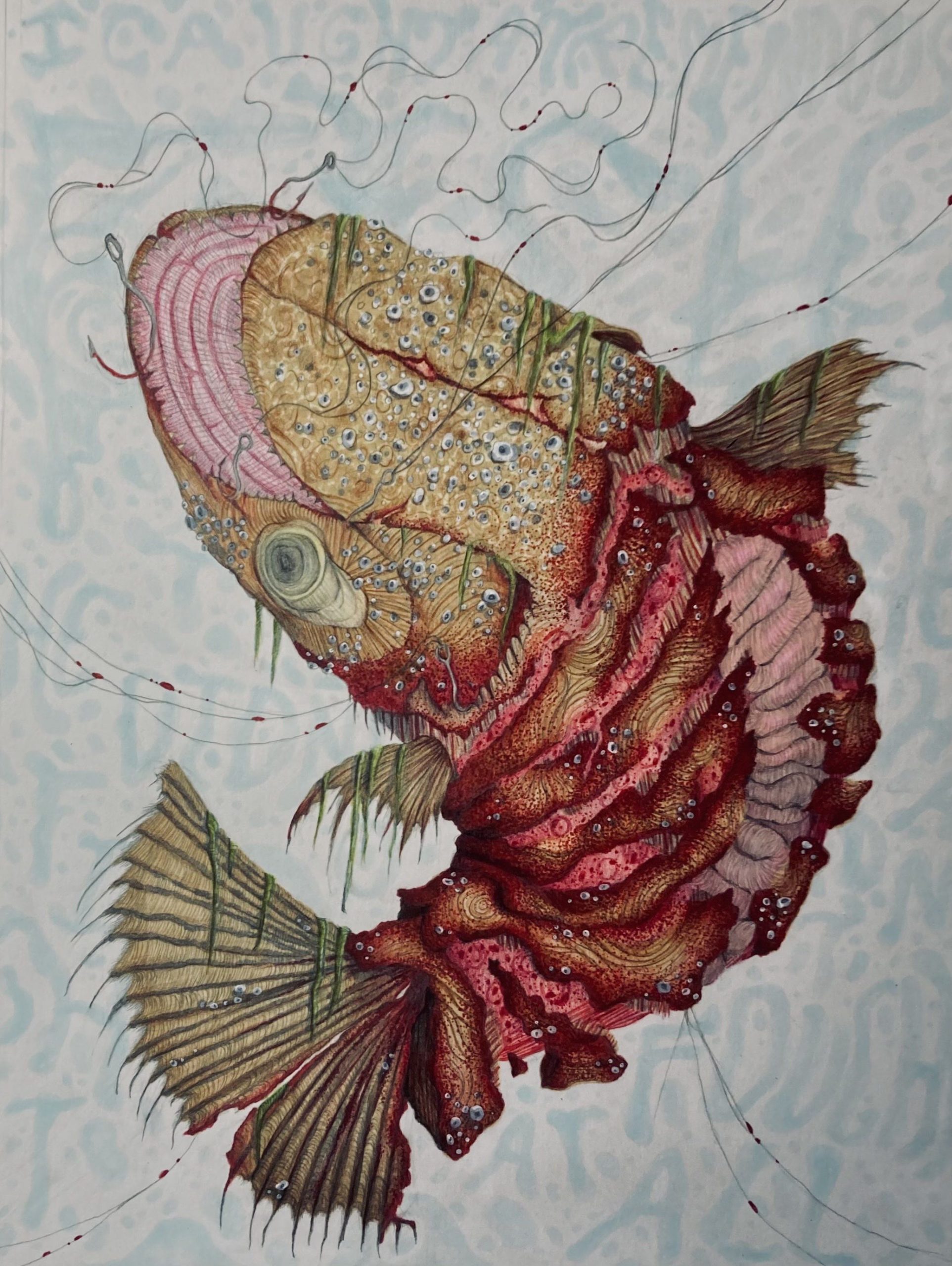 This drawing was inspired by Elizabeth Bishop’s poem “The Fish”. The artist felt the need to illustrate it, because the poem fit the theme of mutilated fish in their portfolio.