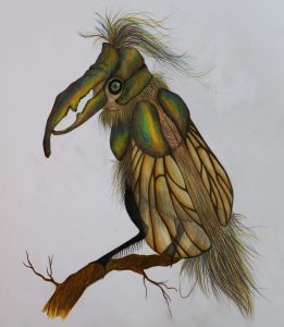 This drawing was an experiment with color, and using multiple layers of mediums such as alcohol markers and colored pencils. The drawing itself is of an alien species (a bird with insect characteristics) that lives on a humid planet, with every inch of land covered with trees.