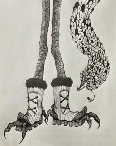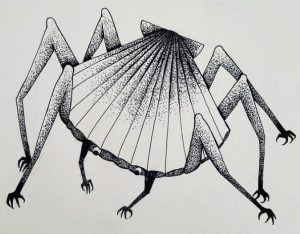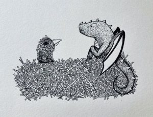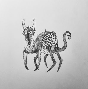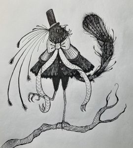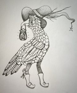 One controversy the artist is most fascinated by is the idea that birds are cameras sent by the government for some avian espionage. With the prompt “Bluff” the artist illustrated (and exaggerated) this idea, to bring this creature born of paranoia to life.